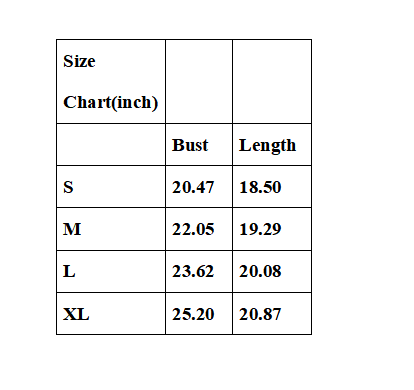 (Size Chart(inch) Bust Length S 20.47 18.50 M 22.05 19.29 L 23.62 20.08 XL 25.20 20.87)